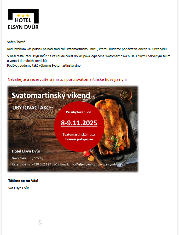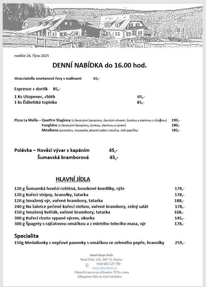 JÍDELNÍČEK DNES | Hotel Elsyn Dvůr, Šumava