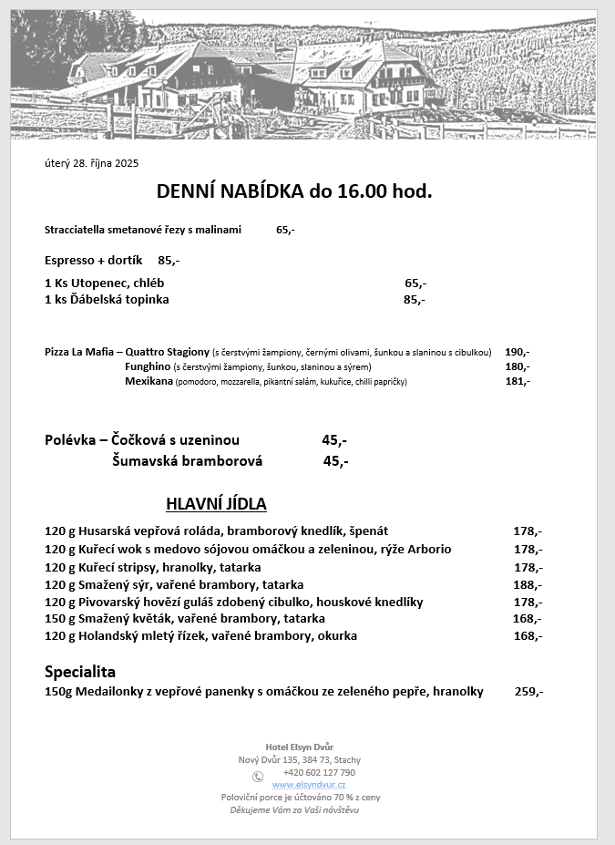 JÍDELNÍČEK DNES | Hotel Elsyn Dvůr, Šumava