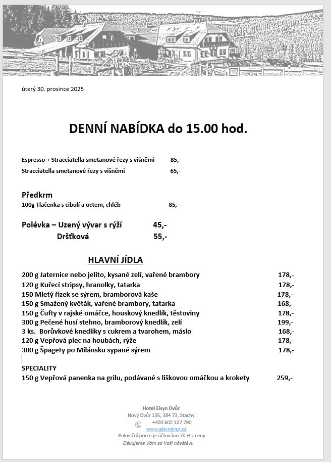 POLEDNÍ MENU - OD 11.00 - 15.00 HOD | Hotel Elsyn Dvůr, Šumava